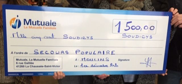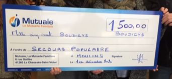 La mutuelle familiale de la section Auvergne, MUTUALE a procédé à la remise d’un chèque de 1500 Soudicys(monnaie locale chez des producteurs locaux) pour apporter son soutien à des achats de produits festifs pour les fêtes de fin d’année pour l’ensemble de la Fédération de l’Allier.