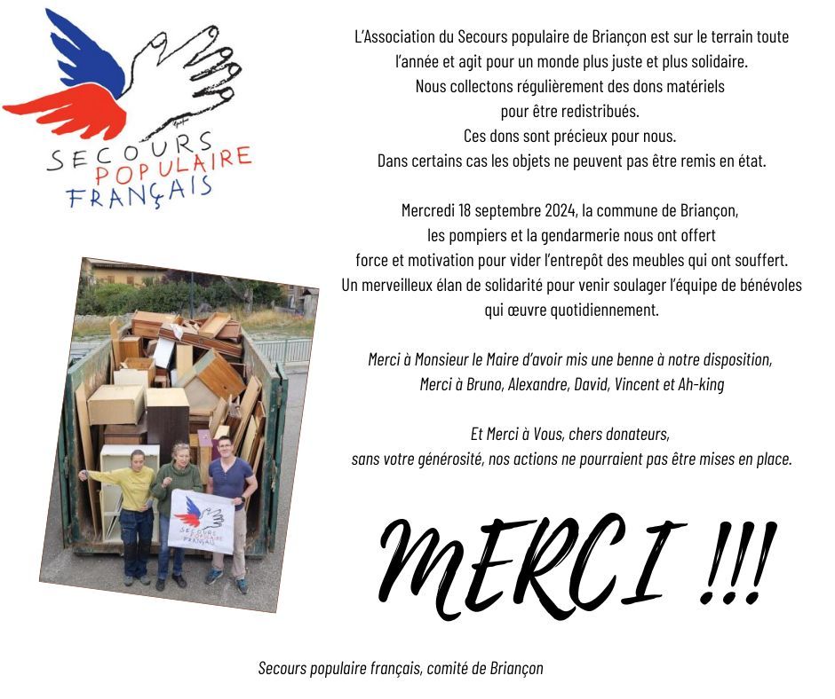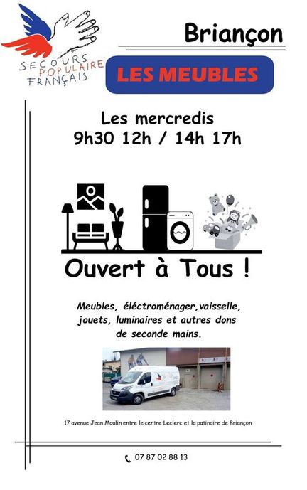 Venez nous voir 17 avenue Jean Moulin (entre le centre Leclerc et la patinoire de Briançon). Vous trouverez : meubles, électroménager, vaisselle, jouets, luminaires et autres dons de seconde main que nous vous proposons contre une faible participation.