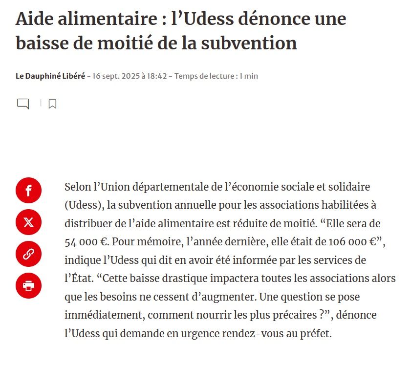 L’Union départementale de l’économie sociale et solidaire (Udess) annonce que la subvention annuelle pour les associations habilitées à distribuer de l’aide alimentaire est réduite de moitié. “Elle sera de 54 000 €. L’an dernier, elle était de 106 000 €”, indique l’Udess.