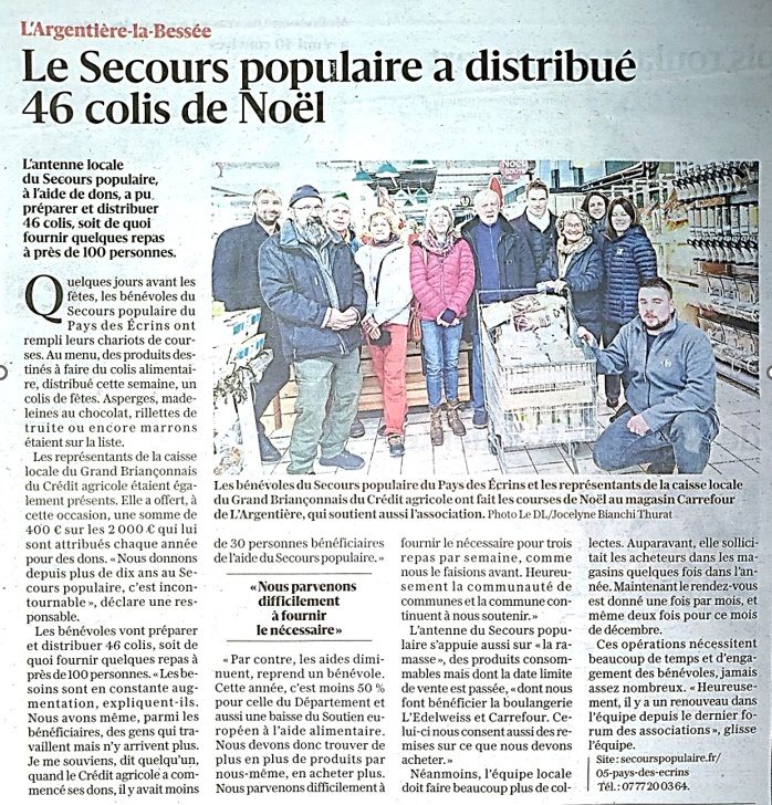 Ce vendredi 19 décembre les bénévoles du comité du Pays des Ecrins s’étaient mobilisés pour la distribution des colis alimentaires complétés à l’occasion de Noël, grâce à l’aide financière du Crédit agricole local qui nous soutient depuis une dizaine d’années.