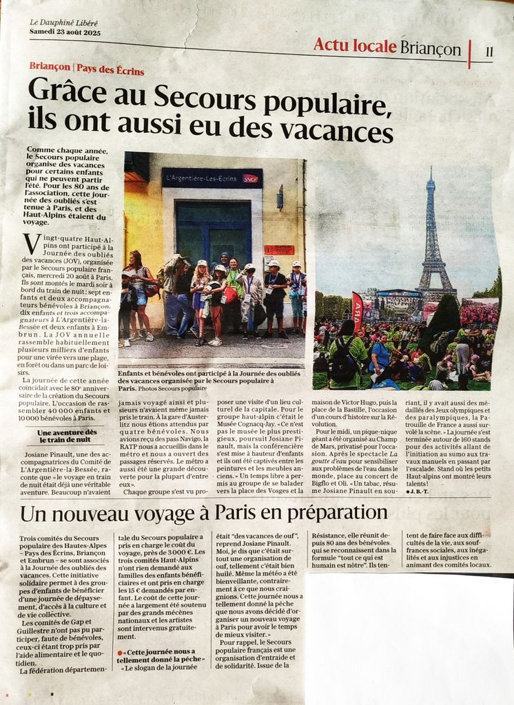 Trois comités du Secours populaire des Hautes-Alpes, ceux du Pays des Ecrins, de Briançon et d’Embrun, participent à la traditionnelle Journée des oubliés des vacances (JOV) qui se tient cette année, année du 80e anniversaire du SPF, LE 20 AOUT, à Paris.