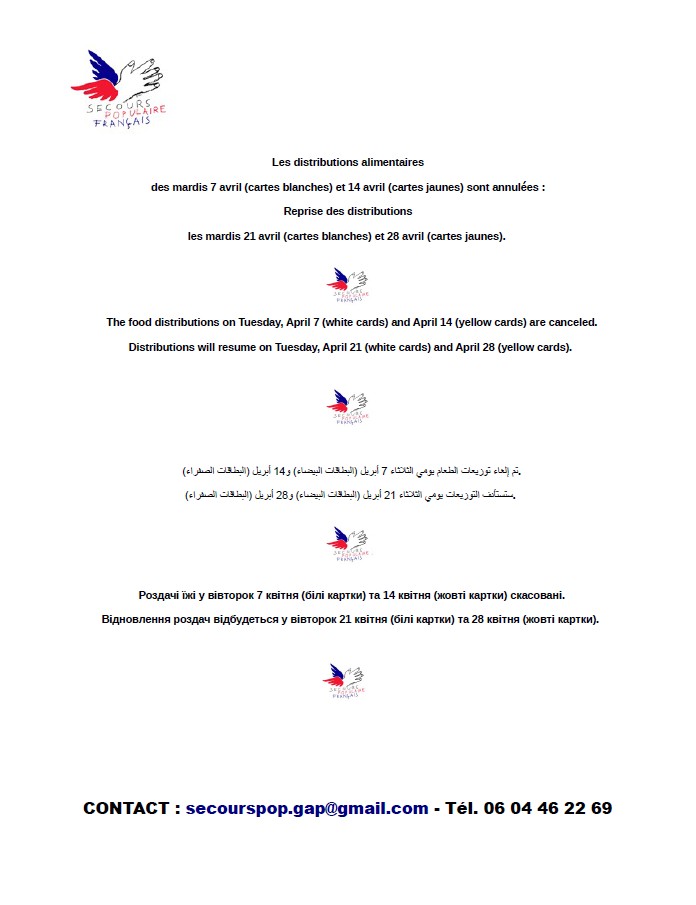 Les distributions alimentaires de notre antenne de Gap des 7 et 14 avril sont annulées pour des raisons indépendantes de notre volonté.