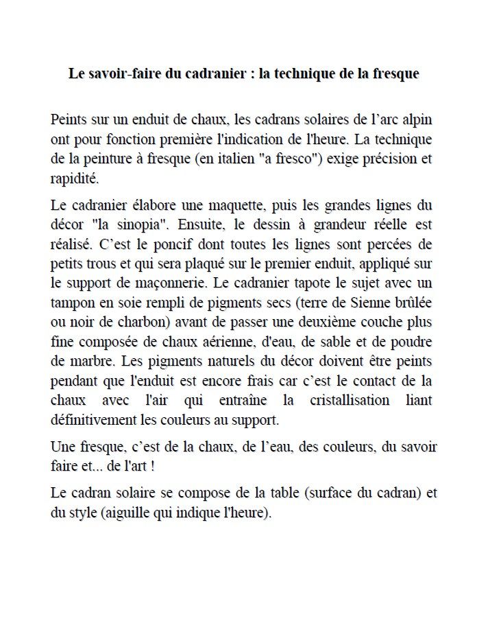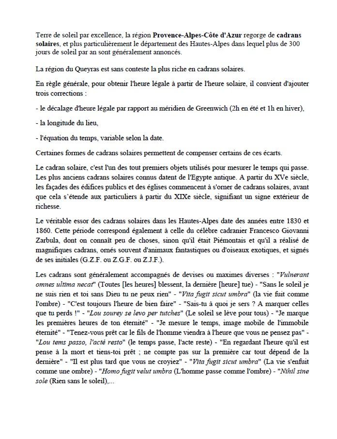 « Longtemps, je me suis couché de bonne heure. » Marcel Proust et sa « Recherche du temps perdu »… Témoins silencieux mais précieux du temps qui passe, œuvres délicates et colorées accrochées aux maisons, aux chapelles et aux églises, porteurs de messages qui interrogent l’homme sur son orgueil et sa condition face à l’immensité de l’univers, les cadrans solaires des Hautes-Alpes sont des livres ouverts sur l’histoire, la nature, la société et la vie.