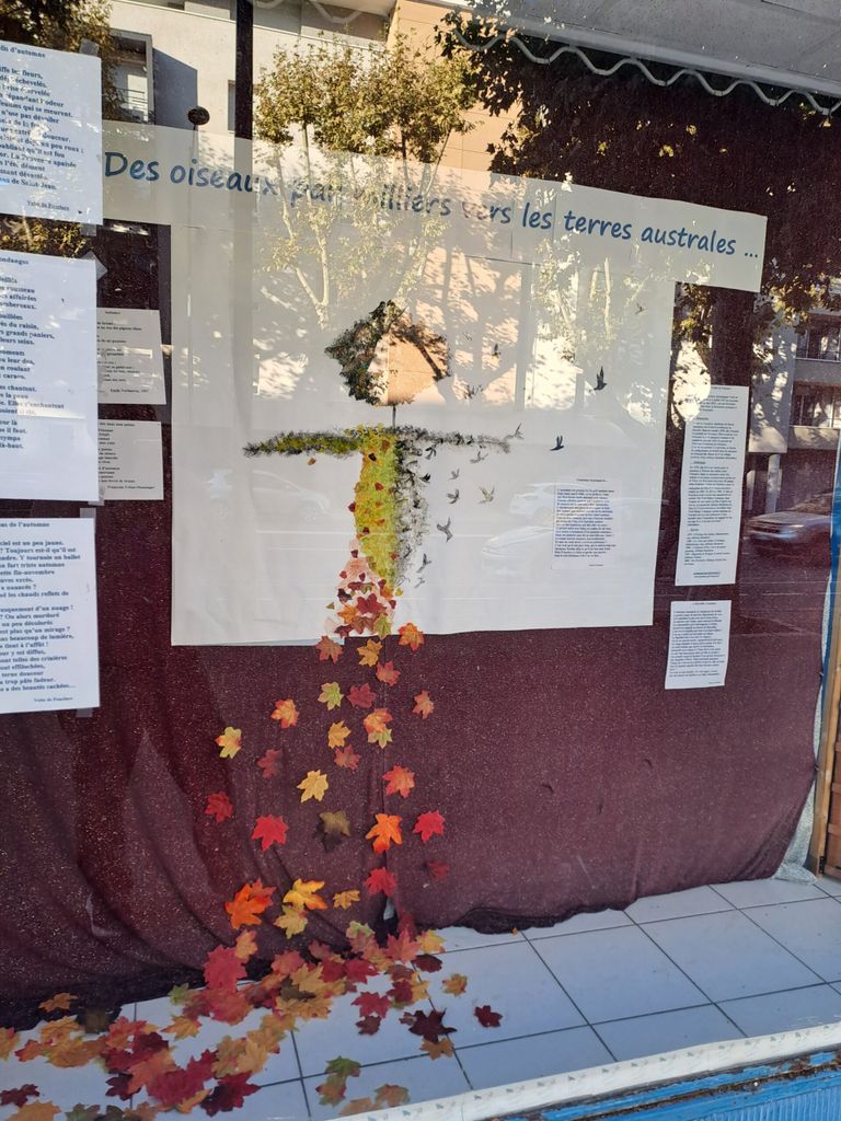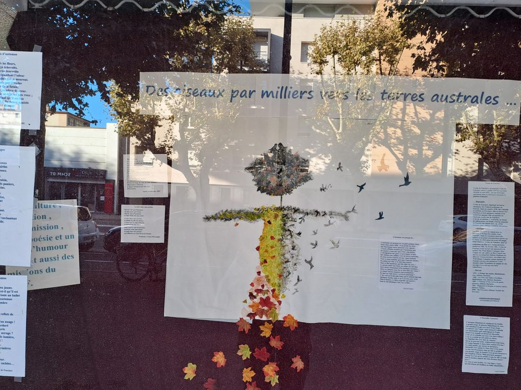 Cette vitrine a été préparée comme à l’accoutumée par nos bénévoles à la recherche de poèmes sur le sujet de l’automne. Elle est aussi devenue un hommage à Vette de Fonclare décédée subitement en avril dernier.