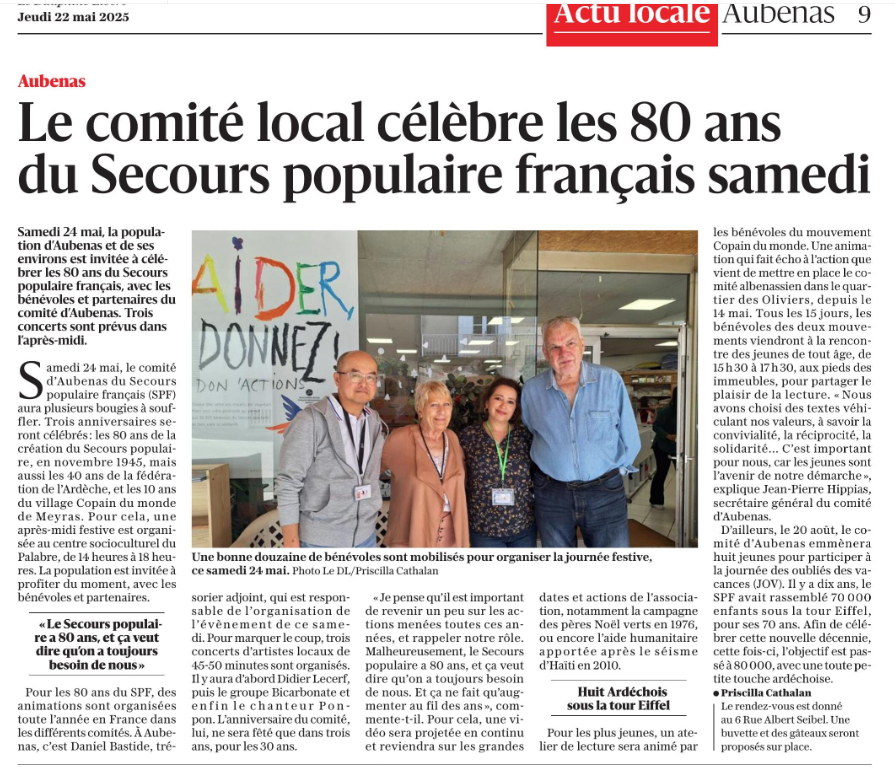 Ce 24 mai, le comité d’Aubenas a fêté 3 anniversaires, les 80 ans du Secours Populaire Français, les 40 ans de la Fédération de l’Ardèche et les 10 ans du Village Copains du Monde de Meyras. Après les 3 discours, l’ensemble des présents ont soufflé les bougies des 80 ans, 40 ans et 10 ans suivi successivement des tours de chants dans la joie et la bonne humeur.