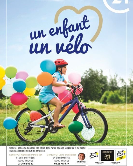 Cet été, à l’occasion de la Grande Boucle, faites une belle action avec CENTURY 21 Martinot Immobilier à Troyes et CENTURY 21 Lairé Immobilier à Troyes au profit du Secours Populaire Troyes Aube qui agit en faveur des enfants défavorisés troyens. ![]()