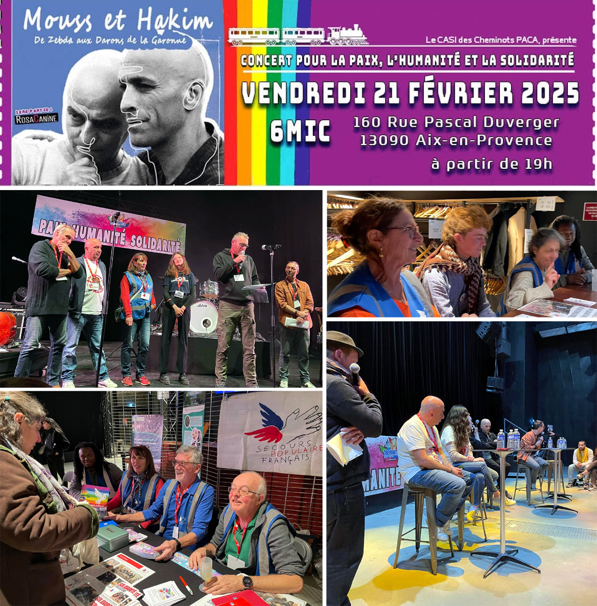 Organisé par le CASI des cheminots de la région PACA, la 5ème édition du "Concert pour la paix, l'humanité et la solidarité" au 6MIC en février 2025 a été l'occasion de belles rencontres et d'échanges autour de thèmes qui nous sont chers.