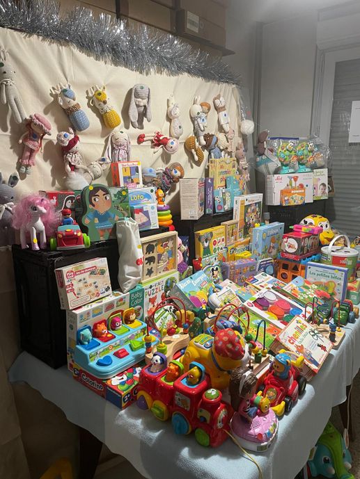 dans des écoles qui ont donné leurs jouets, de nombreux particuliers et entreprises qui ont collecté pour nous, nous avons pu proposer des centaines de jouets qui ont fait le bonheur de nombreuses familles