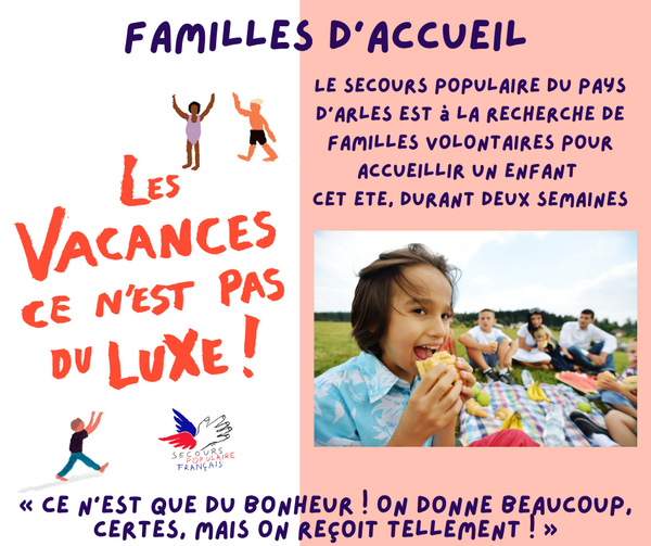 C’est pourquoi le Secours populaire a fait de l’accès aux vacances un droit, car elles sont essentielles au bien-être et à l’équilibre de l’individu. Chaque année, dans le cadre de la « campagne vacances », plusieurs dispositifs sont mis en place, parmi lesquels le dispositif « famille de vacances ». Ce programme permet d’offrir un accueil de vacances aux enfants de familles défavorisées. Encadrées et supervisées par le Secours populaire, les familles volontaires accueillent et financent les vacances d’un ou de plusieurs enfants pour une durée maximum de quinze jours : du 28 juillet au 12 août pour le Comité d’Arles.