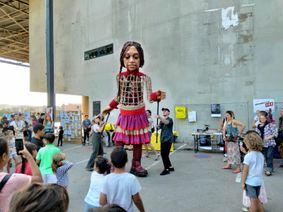 Lors de son voyage, Amal a fait escale à Marseille pendant 2 jours après avoir été reçue auparavant par la Pape François à Rome. Elle fut accueillie tout d’abord au Mucem et au théâtre de la Criée pour le lendemain se montrer le 23 septembre de sa haute et majestueuse stature de 3m50 de la porte d’Aix à la Cité des arts de la rue aux Aygalades, accompagnée par les marionnettes toutes aussi géantes de la Cie Caramantran. De nombreuses associations* (liste en bas d’article) l’attendaient avec de nombreux enfants dont 20 copains du monde.