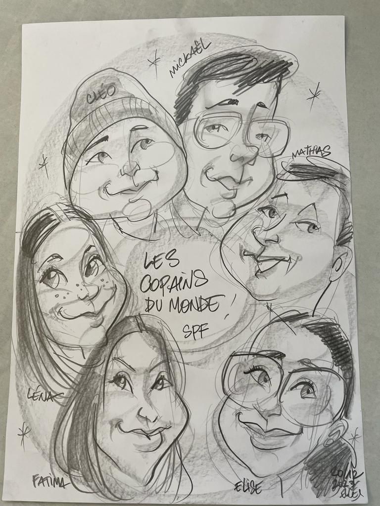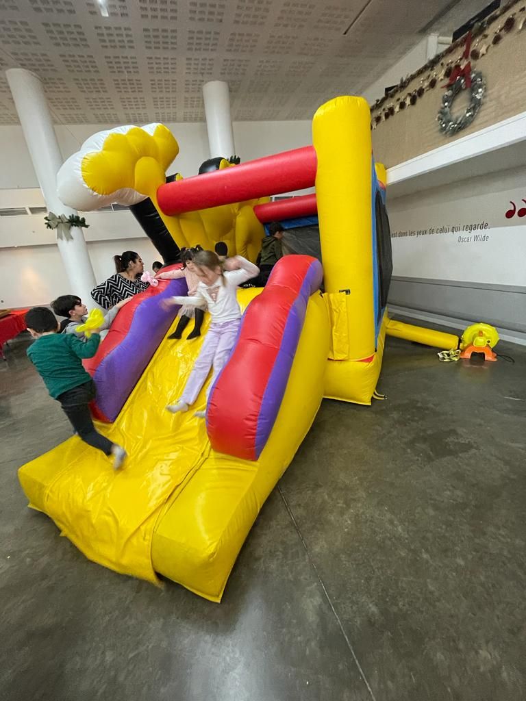 Dès le matin, les bénévoles s’affairaient avec l’aide des nouveaux et nouvelles « Copain du Monde » pour préparer la salle, l’installation des chaises, de tables pour les jeux en bois, les goûters à distribuer aux enfants, etc. Tout est prêt pour accueillir les familles : environ 150 personnes étaient présentes ! Enfants et parents se pressent pour se faire ‘tirer le portrait’ par le dessinateur, prendre une photo souvenir au photomaton, jouer dans la structure gonflable ou encore aux jeux en bois géants…