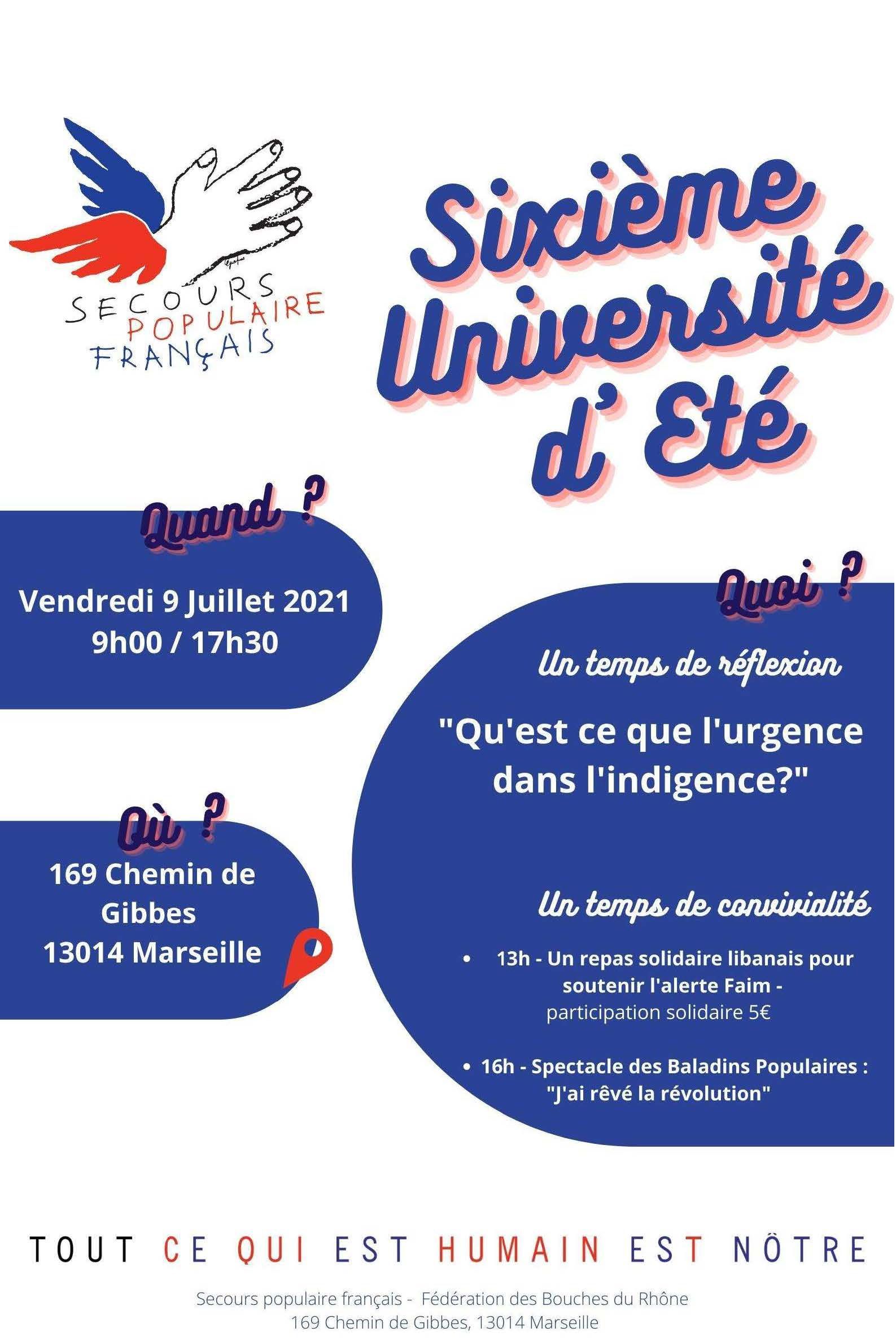 C’est autour du thème de “l’Urgence dans l'indigence” que se sont réunis plus de 70 bénévoles présents à la Sixième université d’été du Secours Populaire qui a eu lieu vendredi 9 juillet. Une journée de réflexion autour de la solidarité, de la convivialité et des partages culturels. Cette journée a en effet été rythmée par un repas solidaire servi au profit de la campagne d’urgence Liban et s’est clôturée par une représentation de la troupe théâtrale du Secours Populaire du 13, les Baladins Populaires qui présentaient leur spectacle “J’ai rêvé la révolution”.