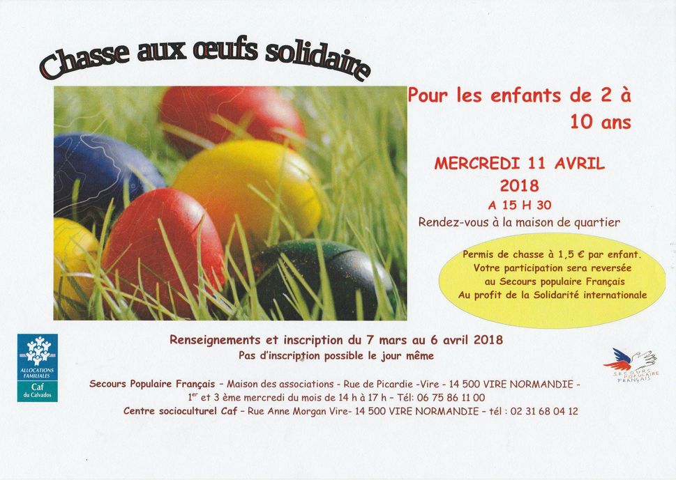 Mercredi 11 avril, à partir de 15h30 Pensez à vous inscrire dès maintenant (date limite d'inscription: 6 avril), soit auprès du Secours Populaire de Vire, soit auprès de la CAF de Vire. Toutes les informations pratiques figurent sur l'affiche.