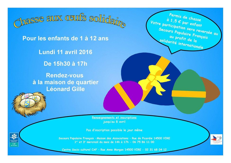 De 15 h 30 à 17 h. Permis de chasse à 1,50 € par enfant. Inscriptions avant le 8 avril au Secours populaire et au centre socio-culturel CAF (rue Anne Morgan)