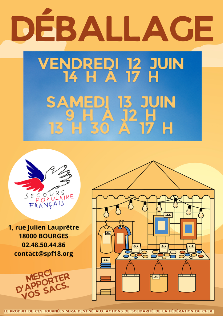 Le vendredi 12 juin de 14h à 17h et le samedi 13 juin de 9h à 12h et de 13h30 à 17h, un grand déballage est organisé. Vous pourrez trouver de tout, vêtements, chaussures, bijoux, décoration, petits ustensiles de cuisine, petits meubles, livres, CD et DVD, jouets …