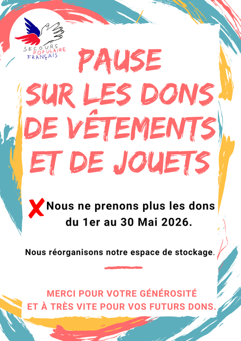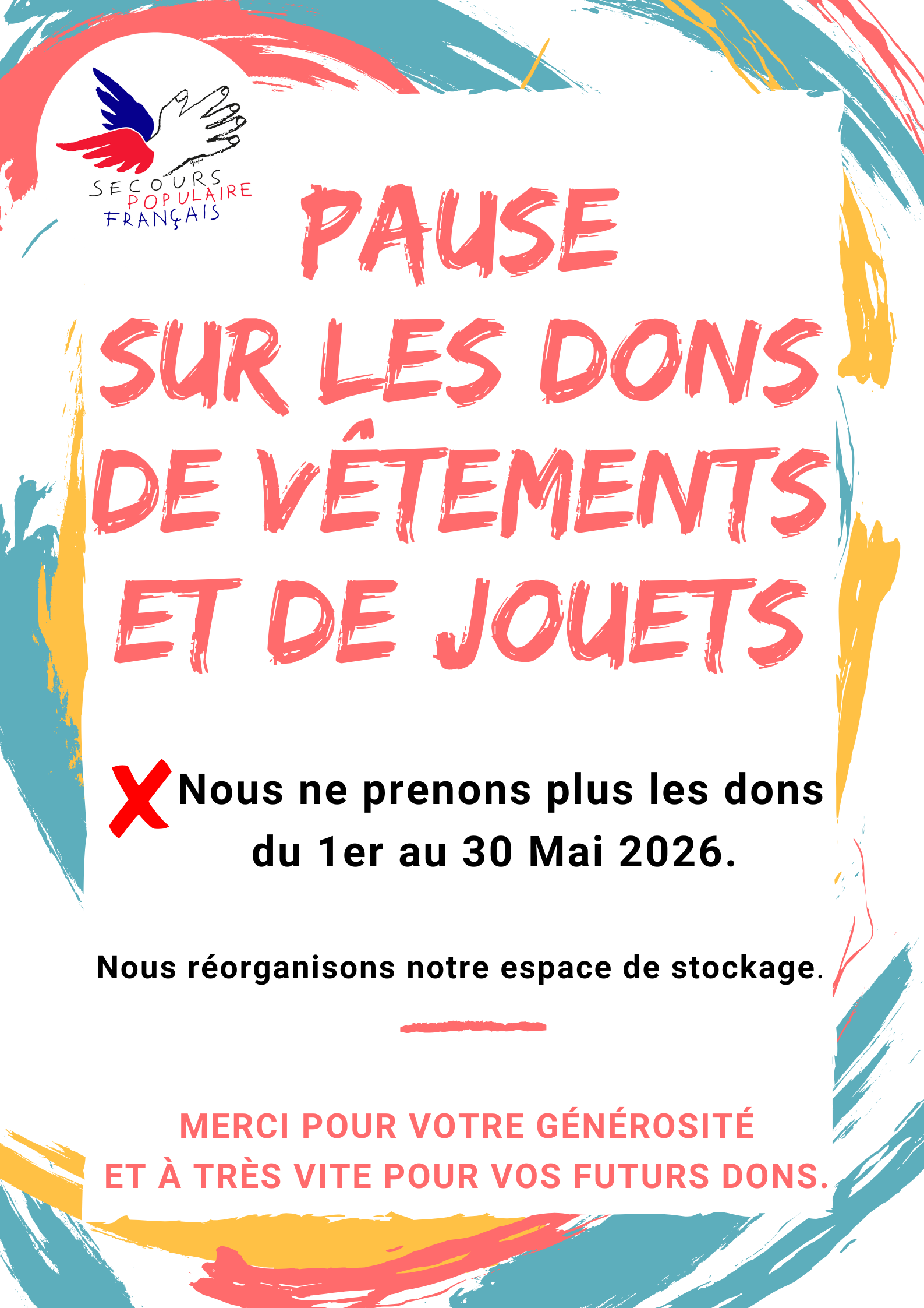 A l’antenne de Bourges arrêt provisoire des dons de vêtements et de jouets du 1er au 30 mai pour cause de réorganisation des espaces de stockage. Merci pour votre compréhension.