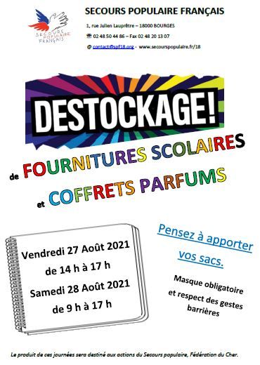 Grand déstockage de fournitures scolaires, jouets et de parfums à l’antenne de Bourges, 1 rue Julien Lauprêtre (anciennement rue de la Gare des Marchandises)