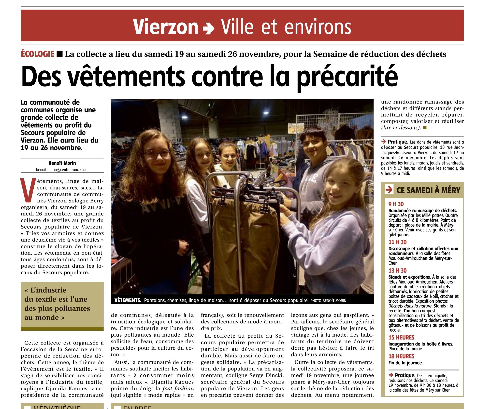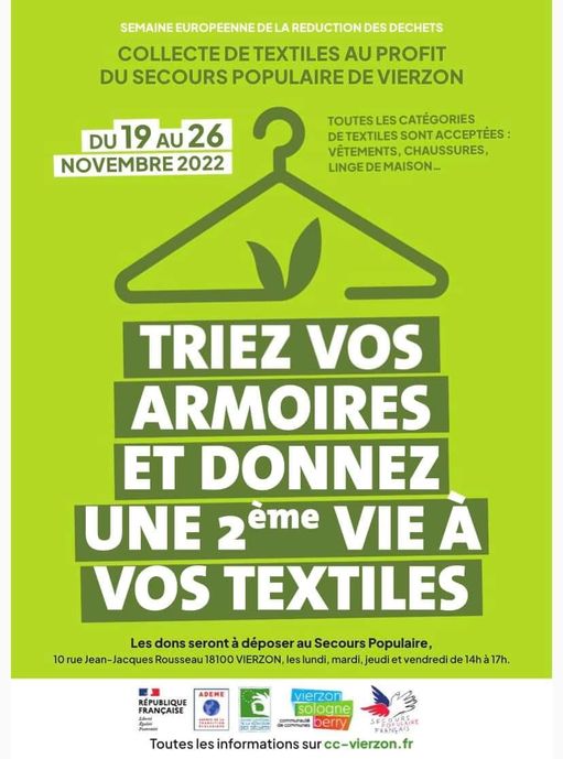 Une collecte de textiles est organisée par la Communauté de Communes Vierzon, Sologne, Berry, dans le cadre de la semaine européenne de la réduction des déchets, du 19 au 26 novembre, au profit du Secours populaire Comité de Vierzon.
