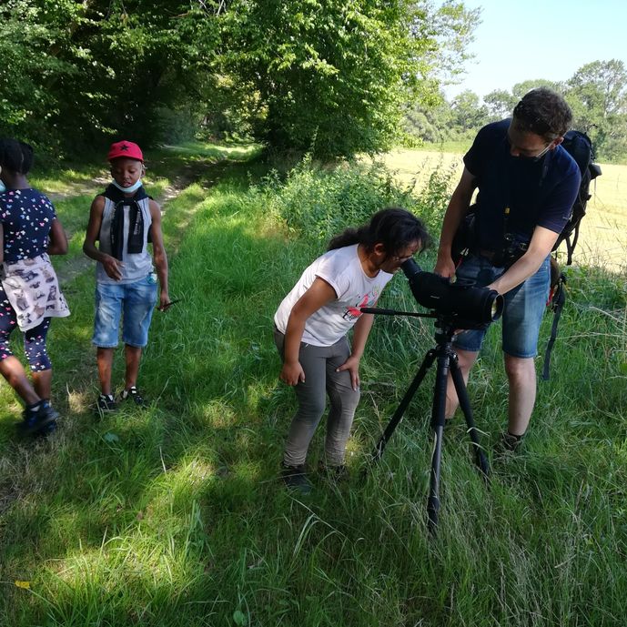 Au programme, en matinée visite du bocage (espace naturel sensible) avec un guide, qui nous a permis d’observer les oiseaux avec sa longue vue. Vers midi ce fût l’heure du pique-nique apporté par les familles sur des tables ombragées dans le parc.