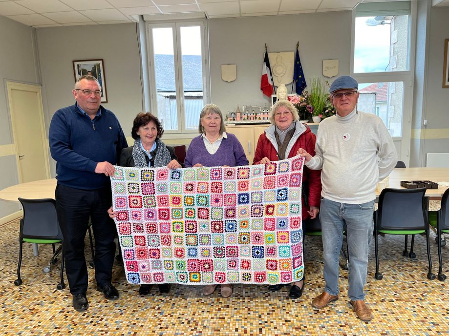 A l’invitation de Mr le Maire de Trouy, le 17 avril, la 600ème couverture réalisée en laine et faite main par les Ateliers de Béa a été offerte aux représentant.e.s, Madeleine et Christian, respectivement animatrice du pôle vestimentaire et secrétaire général adjoint de la Fédération du Cher du Secours populaire français.