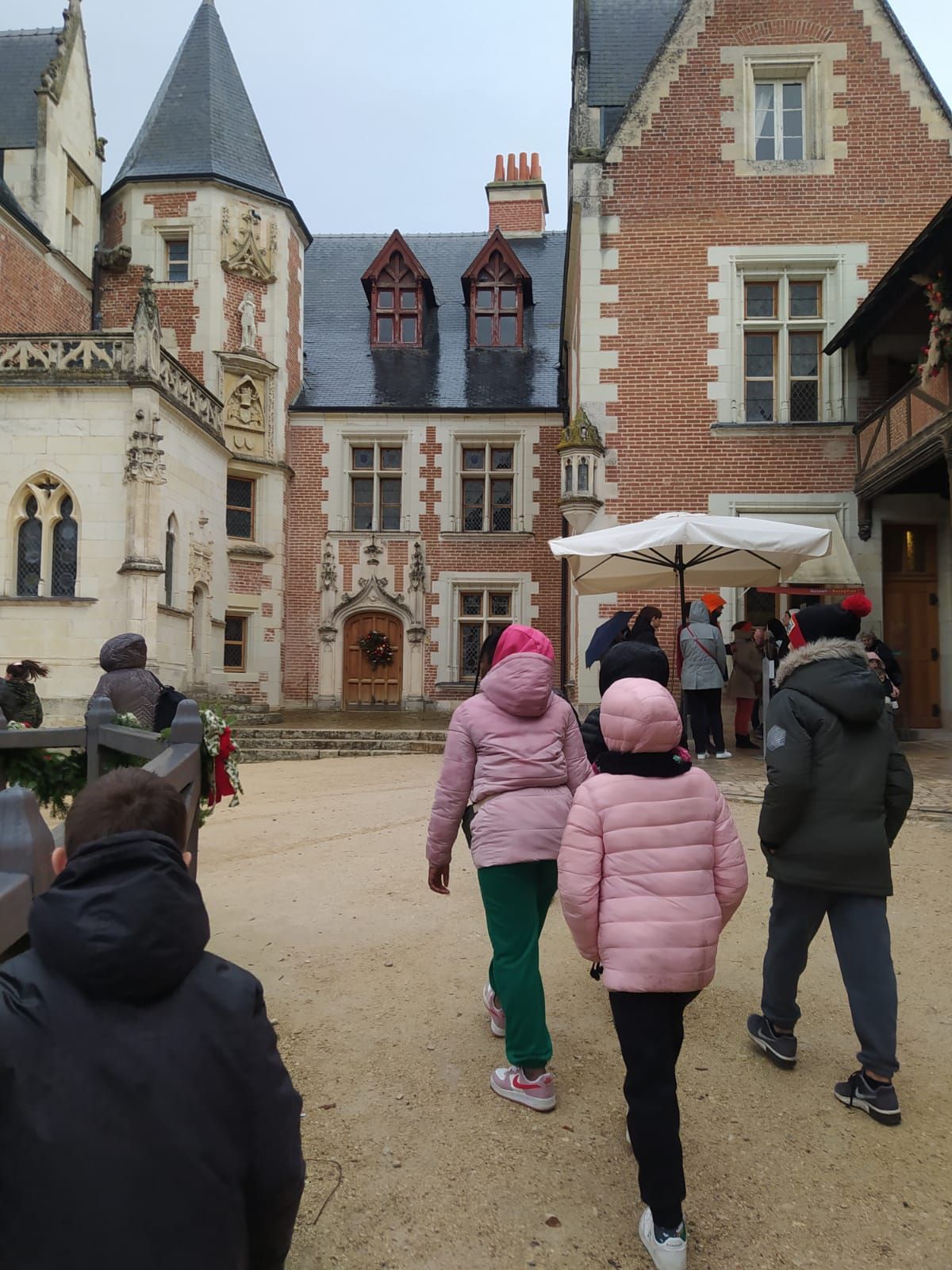Le château royal étant situé aux bords du Clos Lucé, nous nous y sommes rendus en rangs serrés à pied, profitant de cette petite promenade digestive. Arrivés sur place, nous avons commencé par faire le tour des abords du château qui permettent de découvrir un magnifique panorama sur la ville et sur la Loire, puis nous avons entrepris la visite du château, magnifiquement décoré pour les fêtes de Noël : hormis bien entendu la majestuosité de chaque pièce, chacune d’entre elles était décorée d’un grand sapin de Noël richement décoré, un vrai spectacle d’enchantement pour les yeux et l’imaginaire des enfants…