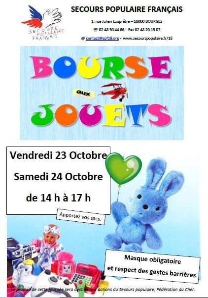 Une grande Bourse aux jouets est organisée les 23 et 24 octobre de 14h à 17h à l’antenne de Bourges du Secours populaire, 1 rue Julien Lauprêtre (anciennement rue de la Gare des Marchandises).