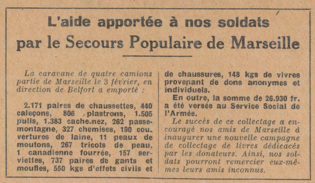 L’action des militants – mais aussi des militantes car il convient de souligner le rôle fondamental de celles-ci dans l’organisation de la solidarité – s’incarne alors en l’organisation de collectes matérielles et l’édition de listes de souscription. C’est ainsi qu’ils sont en mesure de remettre des mandats aux familles de fusillés et d’envoyer des colis de nourriture et de vêtements chauds aux prisonniers. En 1943, treize millions de francs sont collectés dans les ateliers, les bureaux, les foyers de bénévoles, qui se comptent par milliers. La solidarité, les membres du SPFC la mettent aussi en œuvre à l’intérieur même des camps, quand ils sont arrêtés et déportés. Le témoignage d’Hervé Combes, rescapé du camp d’Allach, annexe de Dachau, relayé dans la Défense le 25 mai 1945, est à ce titre précieux. Pour les plus faibles et les plus dénutris, rapporte le militant, la solidarité s’effectuait selon une discipline rigoureuse et quotidienne. Parmi les exemples qu’il partage, citons le « versement volontaire par tous les camarades d’une ou deux cuillerées de soupe à chaque repas, ce qui permet aux plus déficients de recevoir une gamelle supplémentaire ». Ou encore le « versement volontaire d’une bouchée de pain sur la ration journalière, équivalant les derniers temps à 175 grammes ».