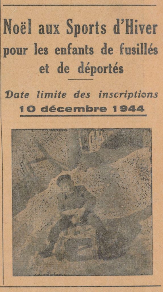 Encart de la Défense, proposant aux orphelins de guerre ou aux enfants de déportés de partir en colonie de vacances au Mont-Dore pour les fêtes de Noël 1944. (Archives du SPF – Source gallica.bnf.fr / BnF)