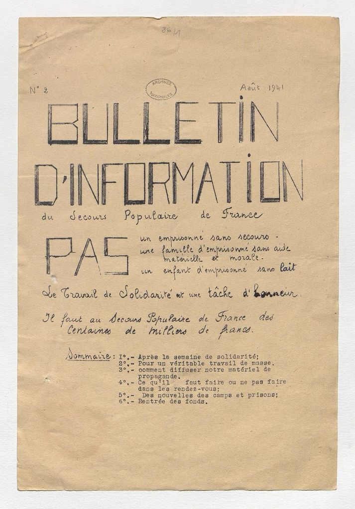 Numéro clandestin du journal du Secours populaire « La Défense », publié en août 1941. (Archives nationales)