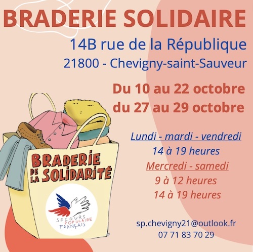 Du 10 au 23 octobre puis du 27 au 29 octobre, le comité local organise sa traditionnelle braderie solidaire au 14B rue de la République à Chevigny-saint-Sauveur.