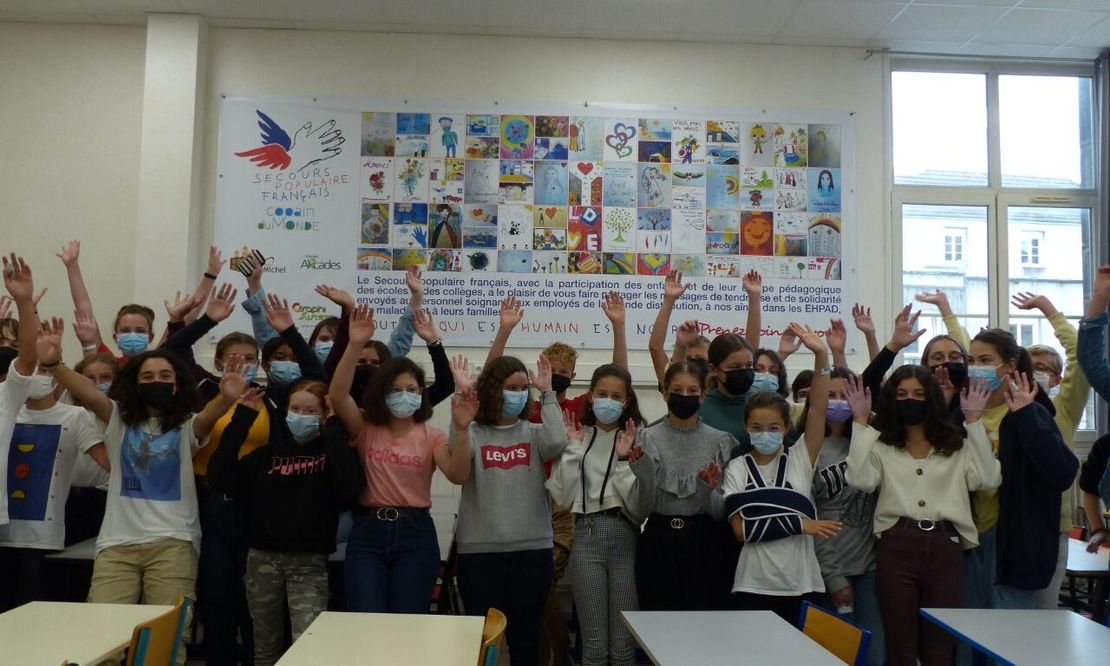 Lors du premier confinement imposé au début de la crise COVID, le Secours populaire francais a lancé un appel aux établissements scolaires qui se sont mobilisés et ont réalisé des « dessins-messages » adressés aux résidents des EHPAD du département, malades et personnel soignant, sapeurs pompiers, personnel de la grande distribution.