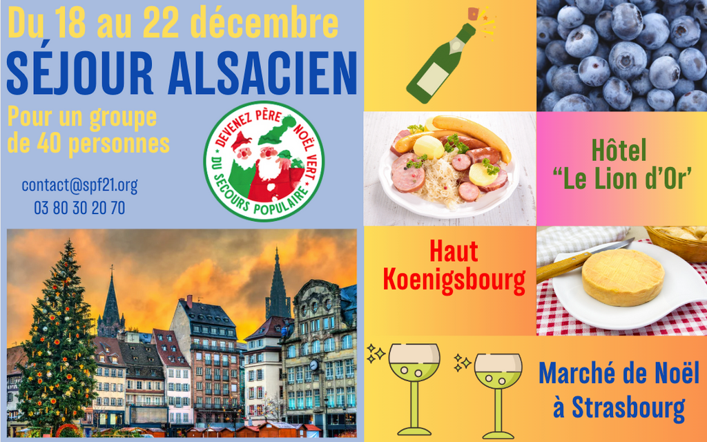 Quant au Secours populaire de Dijon, propose à 40 personnes aidées par notre association vont profiter d’un séjour de 5 jours en Alsace, en effet du 18 au 22 décembre, le groupe sera hébergé à l’Hôtel Restaurant « Le Lion d’Or » à La Petite Pierre (67290)