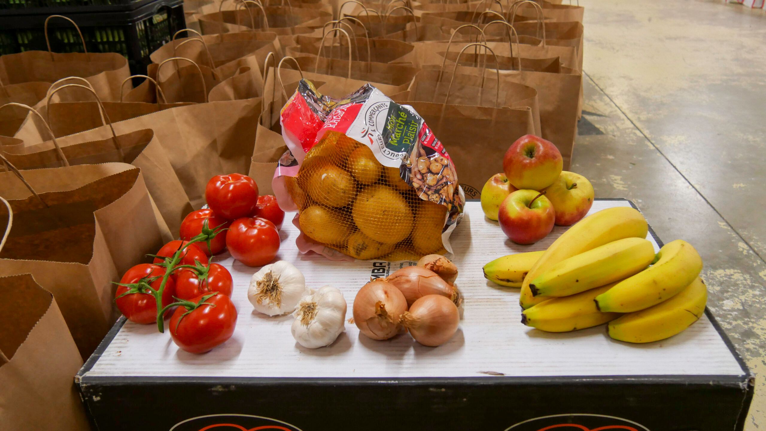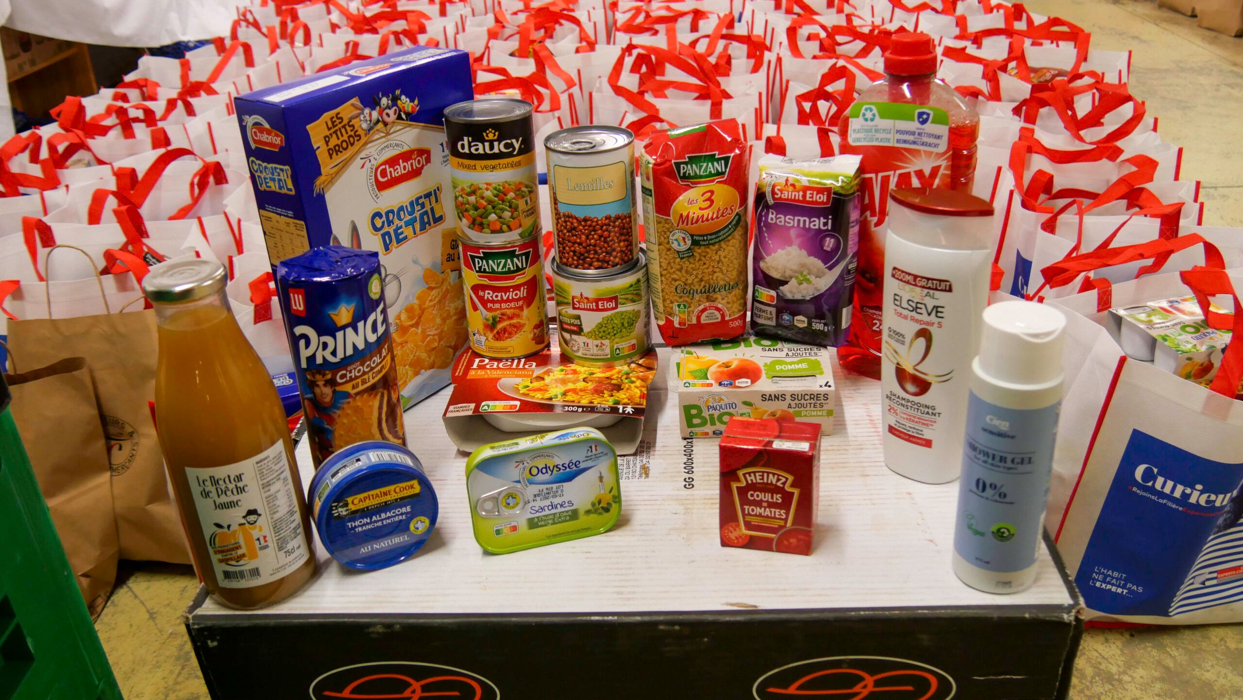 Lors de la distribution à l’antenne de St-Brieuc, les étudiants repartaient avec deux sacs. Le premier contenait 14 produits secs (pâtes, riz, sauce tomate, compotes de pomme, boîte de céréales, bouteille de jus, paquet de biscuits, boîtes de conserves avec haricots verts ou petits pois et lentilles, macédoine, raviolis, sardine, thon) et 3 produits d’hygiène (gel douche, shampoing, produit nettoyant). Le second se composait de produits frais (ail, oignons, bananes, fromage, œufs, pommes, pommes de terre, tomates).
