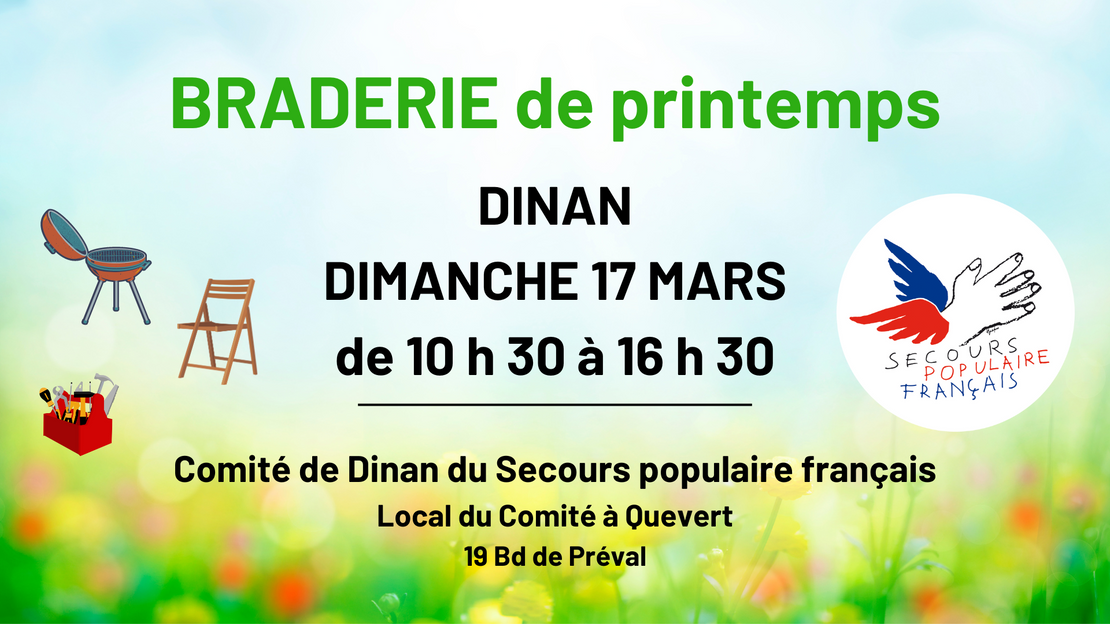 Le comité de Dinan du Secours populaire français vous invite à sa braderie de printemps où le bricolage et le jardinage seront à l’honneur à l’extérieur : barbecues, chaises en teck, outils…