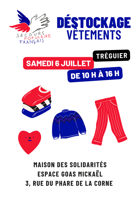 Le comité de Tréguier du Secours populaire français vous invite à un grand déstockage de vêtements, livres, chaussures… le samedi 6 juillet 2024.
