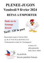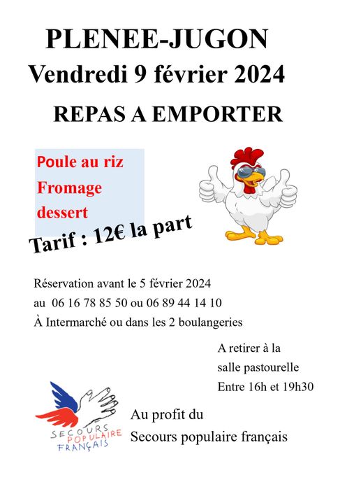L’antenne de Plénée-Jugon du Secours populaire français renouvelle son opération repas à emporter. Au menu : poule au riz, fromage, dessert. 12 € la part, à récupérer le vendredi 9 février, salle pastourelle, entre 16h et 19h30.