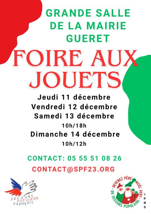 🎄 FOIRE AUX JOUETS 🎄 Grande Salle de la Mairie de Guéret Jeudi 11, vendredi 12 et samedi 13 décembre de 10h à 18h Dimanche 14 décembre de 10h à 12h Ouvert à tous. Venez nombreux ! Les fonds collectés permettront de financer la campagne des Pères Noël verts initiée par le Secours populaire de la Creuse.