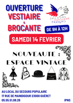 OUVERTURE des boutiques Vestiaire, Brocante et espace Vintage le samedi 14 février de 9h/12h dans les locaux du Secours Populaire de Guéret, 17 rue de Maindigour 23000 Guéret. Lors de cette ouverture les personnes trouveront des équipements pour la maison, livres, chaussures, vêtements(femme, homme, enfants) et un nouvelle espace vintage ( sacs, vêtements, etc...). Les fonds récoltés serviront au fonctionnement du SPF, achats alimentaires, sorties, etc... Nous espèrerons que vous serez nombreux à venir nous rencontrer lors de cette ouverture.