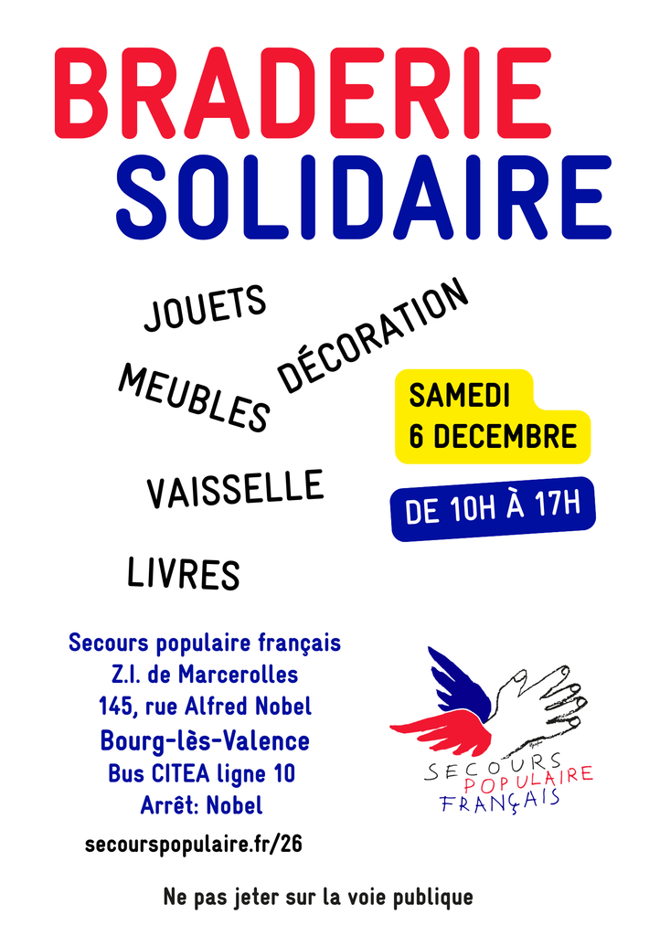 Le Secours populaire – antenne de Valence organise une braderie solidaire le samedi 06 décembre, de 10h à 17h, à Bourg-lès-valence.