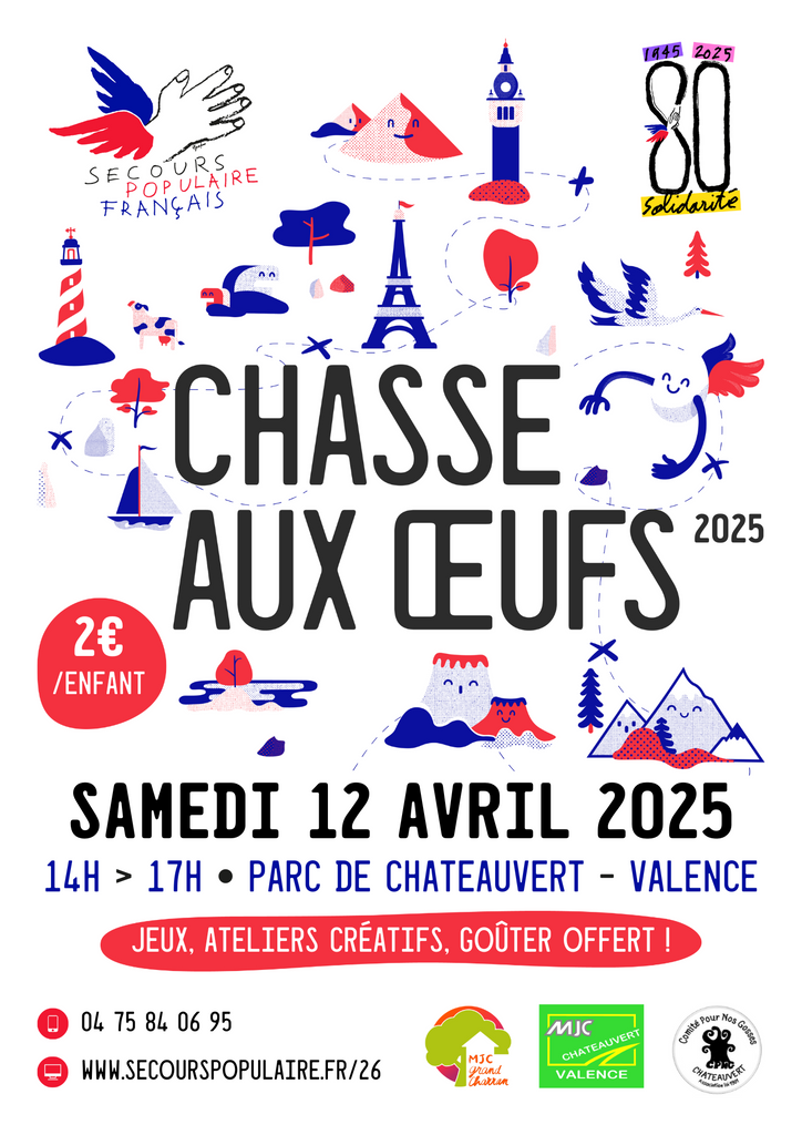 Participez avec le Secours populaire français, à notre chasse aux œufs pour Pâques, le samedi 12 avril 2025 au Parc de Chateauvert à Valence. Une aventure festive pour les enfants, remplie de surprises et de gourmandises !