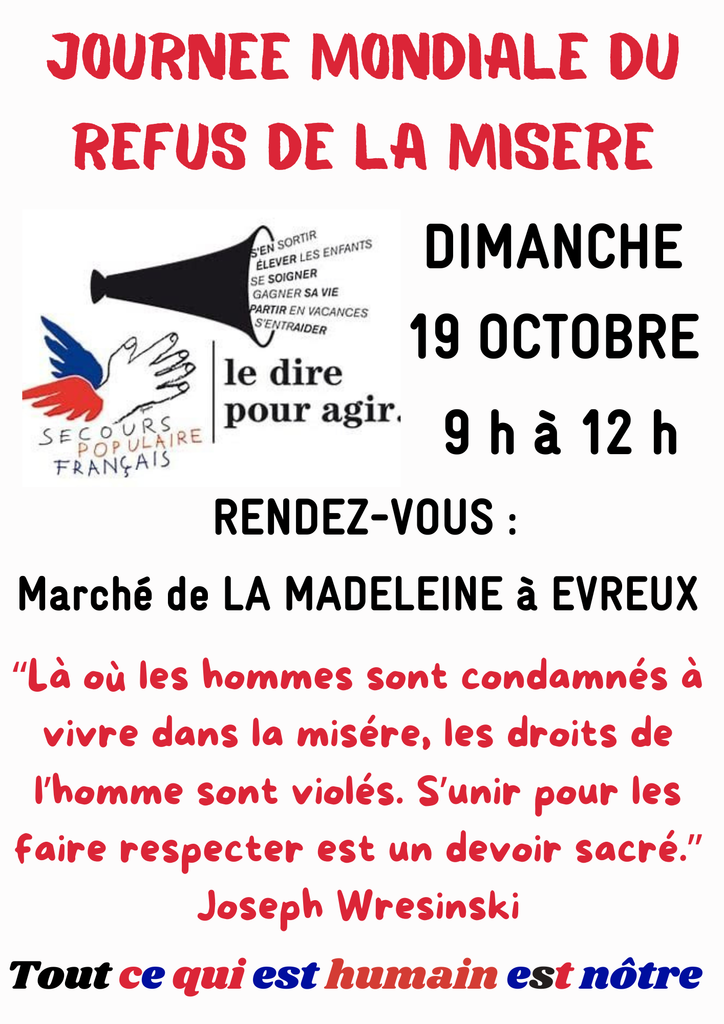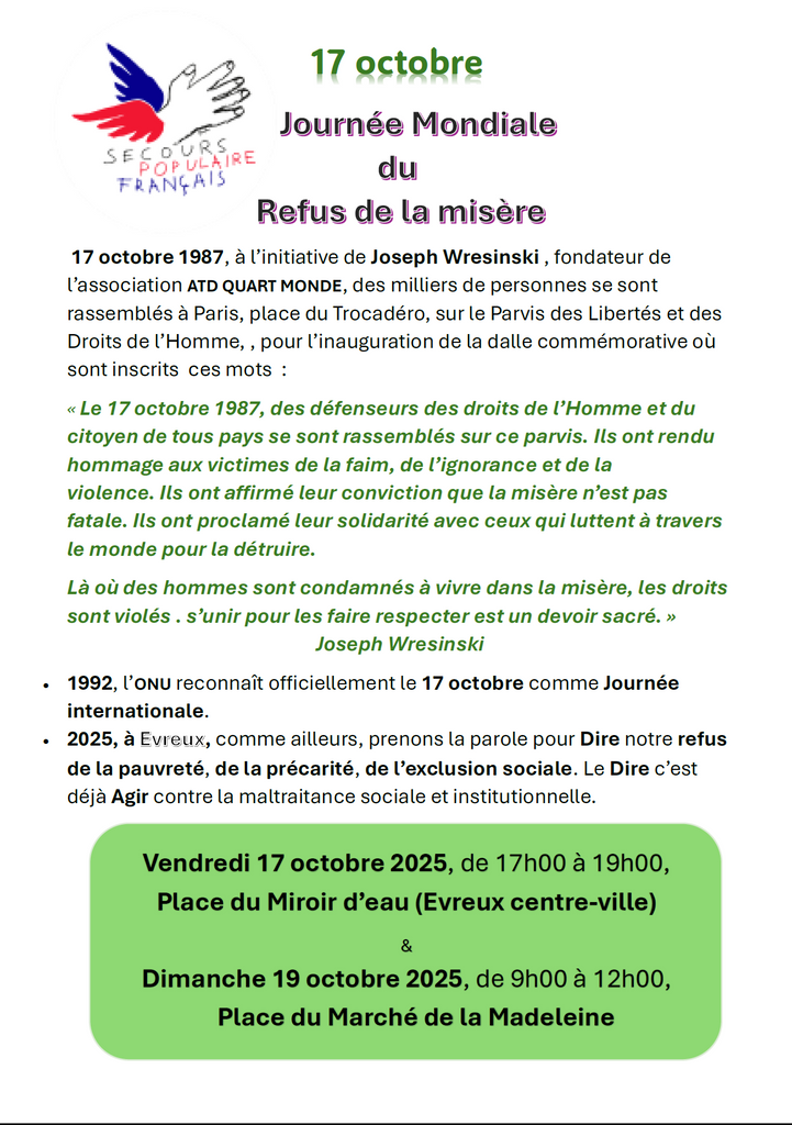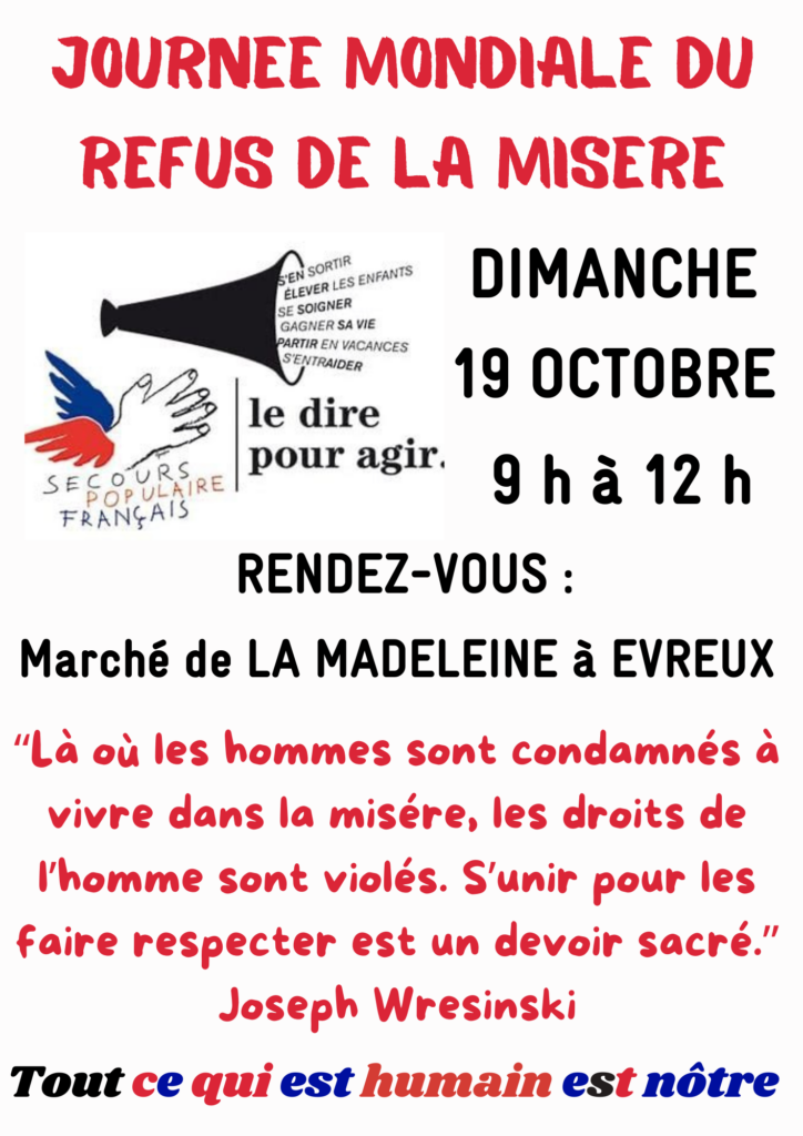 2025, à Evreux, comme ailleurs, prenons la parole pour Dire notre refus de la pauvreté, de la précarité, de l’exclusion sociale. Le Dire c’est déjà Agir contre la maltraitance sociale et institutionnelle.