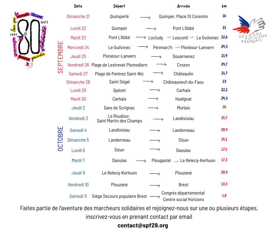 Un itinéraire symbolique : chacune des 29 étapes relie une antenne ou un comité du Secours populaire du Finistère. Les marcheurs arriveront à l’issue du parcours lors du congrès départemental, à Brest.
