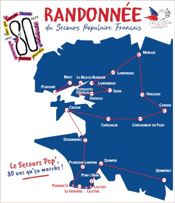Un itinéraire symbolique : chacune des 29 étapes relie une antenne ou un comité du Secours populaire du Finistère. Les marcheurs arriveront à l’issue du parcours lors du congrès départemental, à Brest.