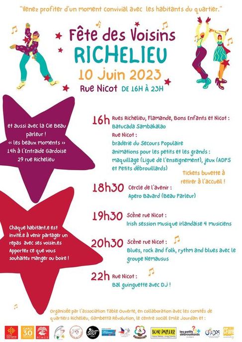 Samedi 10 juin à 16 heures, fêtes des voisins quartier Richelieu, rue Nicot à Nîmes.