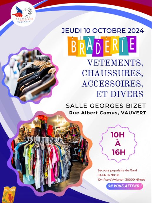 Jeudi 10 octobre, de 10h à 16h, Salle Georges-Bizet, rue Albert-Camus. Vauvert. Rens : Secours populaire du Gard 04 66 02 98 98.