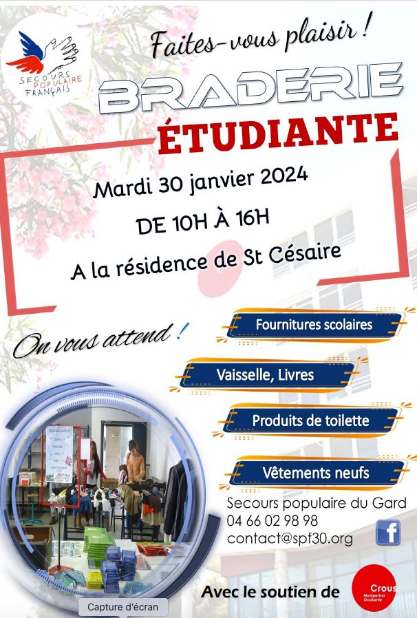 A Nîmes, des centaines d’étudiant-es vivent dans la précarité. Depuis plusieurs années, une équipe de bénévoles du Secours populaire, épaulée par des étudiants eux mêmes, va chaque semaine dans deux lieux pour apporter aide alimentaire, conseils et du réconfort. Le 30 janvier, c’est à la résidence de St-Césaire que se déroulera la braderie étudiante. Fournitures, livres, habits neufs, vaisselle… seront proposés moyennant une participation modique. Chacun-e pourra trouver de quoi se faire plaisir.