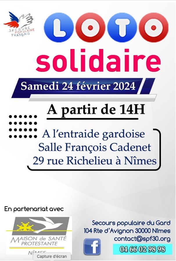 La campagne Don actions vient de démarrer aux quatre coins du pays. Le 24 février, à Nîmes, les amateurs de loto sont invités à conjuguer le plaisir de jouer et celui de donner. Tous les renseignements utiles se trouvent sur l’affiche.