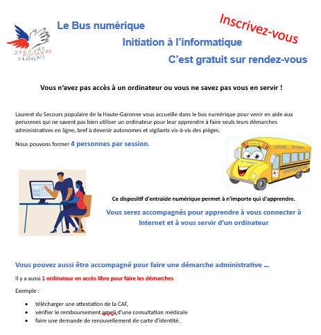 Le Bus numérique vient régulièrement au local Secours Populaire de Castanet-Tolosan au 6 rue des écoles pour que les accueillis bénéficient des apprentissages du numérique.