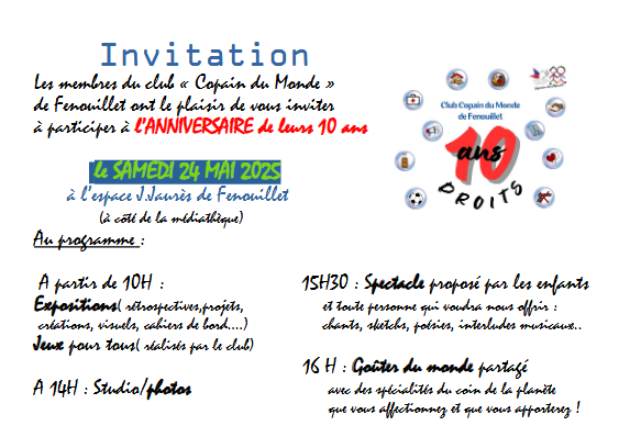 Mouvement des enfants et adolescents du Secours populaire français, le Club Copain du Monde de Fenouillet fête ses 10 ans et vous invite à rejoindre sa fête pour une journée de sensibilisation aux droits des enfants et à la solidarité internationale.