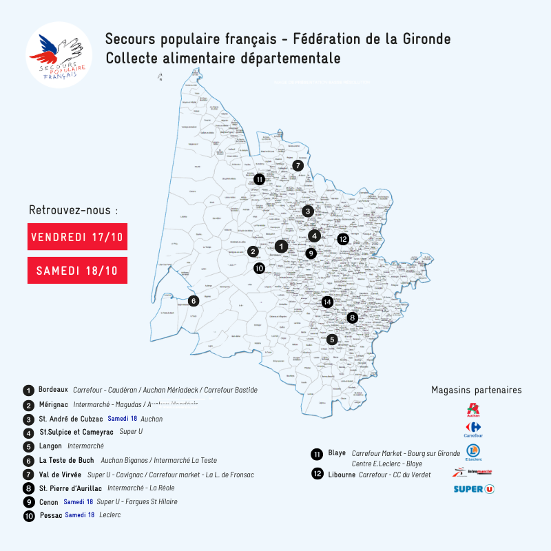 La collecte annuelle départementale aura lieu vendredi 17 et samedi 18 octobre dans tous les magasins partenaires en Gironde. Cette collecte est essentielle pour reconstituer les stocks de denrées alimentaire, d’hygiène et de puériculture à destination des personnes aidées dans nos 35 permanences en Gironde.